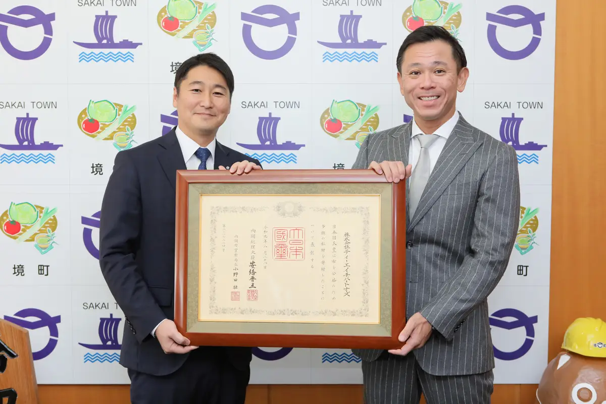 受章に伴い、茨城県境町にて11月20日(水)紺綬褒章伝達式が行われ、境町の橋本町長より褒状が授与されました。