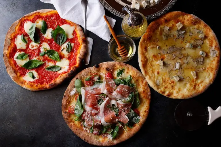 ピッツァ(左より)トマト・モッツアレラ・バジルのマルゲリータ、生ハムとルッコラのピッツァ、4種のイタリアンチーズのピッツァ