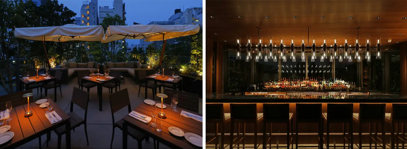 ペット同伴可のテラス席は四季折々の自然あふれる緑地を眺めながら、優雅な時間をお楽しみいただけます。ランチからディナーまで終日営業をしており、ハワイの店舗とは異なるラグジュアリーでありながら親しみやすく洗練されたモダンな空間でいつでもお客様をお待ちしております。本格的なバーカウンターや、大きな窓からの景観を楽しめる窓側の席、煌びやかなシャンデリアが印象的なメインダイニング、プライベート空間が確保された個室など、様々なシーンでご利用いただけます。