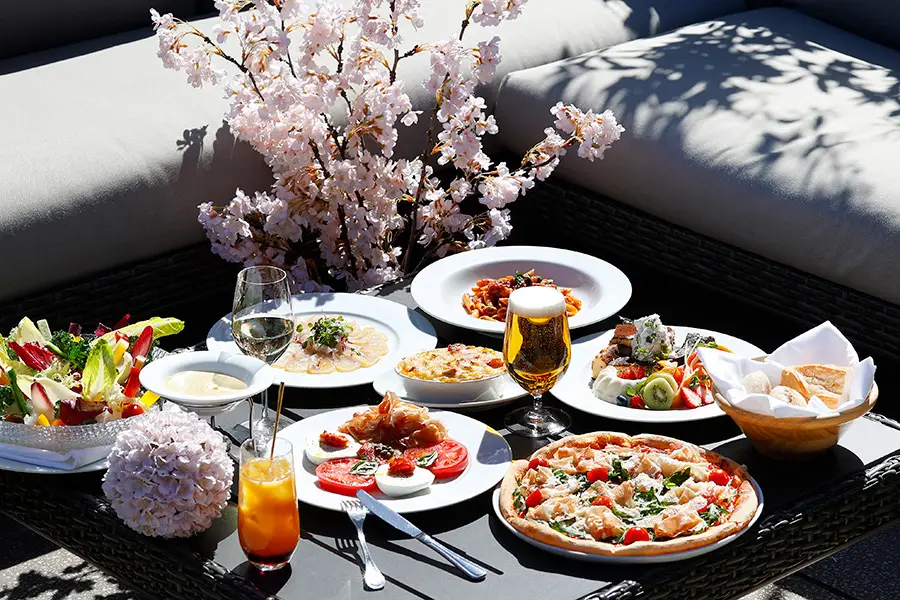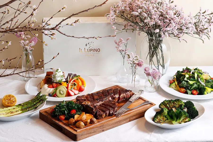 春の桜シーズンにあわせて、お花⾒シーズン限定のプランが登場。ペット同伴可のテラス席でお召し上がりいただくプランは、⼈気な前菜メニューやピッツァがラインナップし、さらに追加料⾦でフリーフローもお楽しみいただけます。テイクアウトBOXには、USDA PRIME T-BONE ステーキや、フレッシュなお野菜を堪能できるメニューを揃えました。また、イル・ルピーノ・プライムの店舗にも桜が点在し、お花⾒気分をご体験いただけます。
